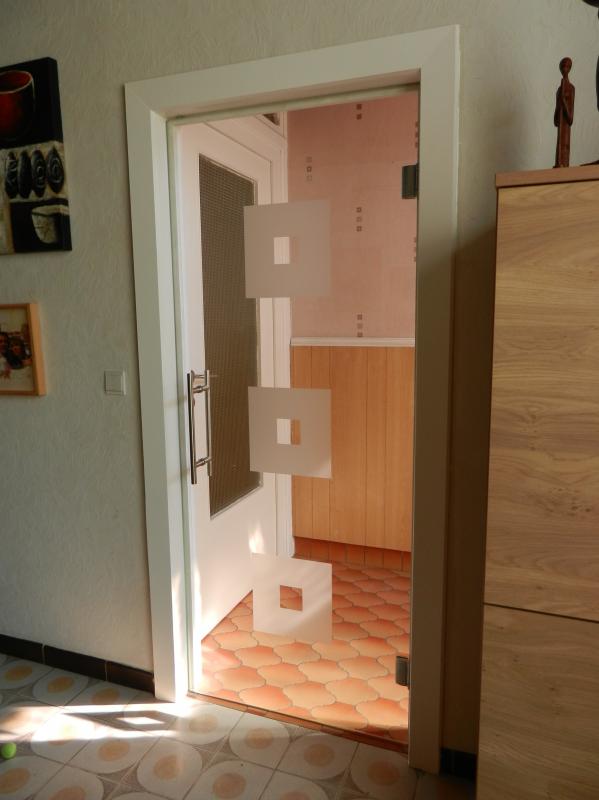 Porte en verre motif carré sablé et clair monté sur charnières