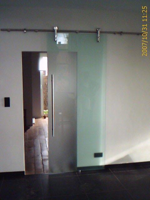 Porte en verre acidé monté sur rail coulissant apparent en Inox poignée tirant Inox